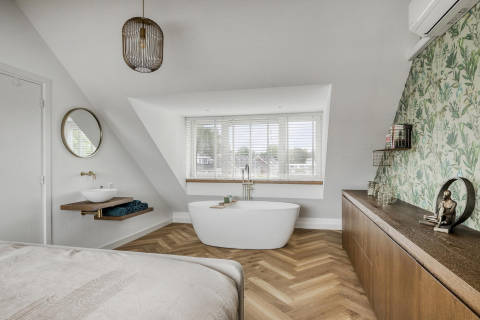 De badkamer van ruim 6 m² is compleet ingericht met een heerlijk hoekbad waarin je ook kunt douchen, een staand toilet, en een wastafelmeubel met veel opbergruimte. Het raam met melkglas zorgt voor natuurlijk licht en extra privacy. Dit is een fijne ruimte waar je de dag ontspannen kunt beginnen of eindigen.