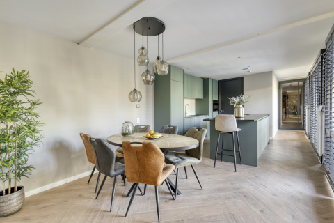 Aan de achterzijde van de woning bevindt zich de praktische U-vormige keuken, die van alle gemakken is voorzien. Denk aan een grote koelkast, vaatwasser, spoelbak met kraan, 5-pits gaskookplaat en een afzuigkap. Het royale werkblad biedt volop ruimte om te koken, bakken of je favoriete apparaten neer te zetten. De gezellige bar met plek voor krukjes is ideaal om ’s ochtends een kop koffie te drinken of ’s avonds met een drankje gezellig bij te praten. Vanuit de keuken loop je zo de achtertuin in.