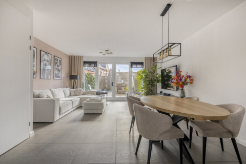 De woonkamer met open keuken (samen ca. 37,1 m²) voelt meteen ruim en licht aan dankzij de grote raampartijen aan de voor- en achterzijde. Hier kun je gemakkelijk een grote hoekbank en een eettafel voor zes personen plaatsen. De laminaatvloer loopt vanuit de hal door en zorgt voor een warme, uniforme uitstraling. De wanden zijn voorzien van granol en het plafond is strak gespoten.